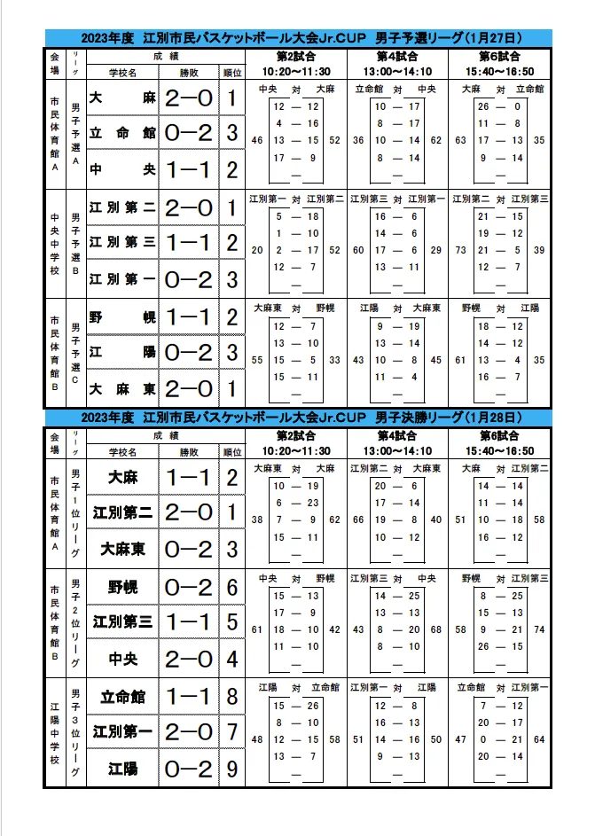 2024年度 江別市民体育大会(中学の部)-結果報告- 2024 2/09 お知らせ 活動内容 2024年1月29日2024年2月9日 2024年1月27日(土)、28日(日)に行われた江別市民体育大会(Jr.CUP)が終了しました試合結果は以下の通りとなりました お知らせ 活動内容 関連記事 2025年度 勤労者体育大会組み合わせ決定 2026年1月10日 2025年度 江別市民スポーツ大会 組み合わせ決定のお知らせ 2025年12月7日 【重要】大会内での画像、動画の取り扱いについて 2025年12月4日 2025年度 江別市民スポーツ大会参加申し込み開始 2025年10月25日 2025年度 倉島杯終了報告 2025年9月22日 2025年度倉島杯大会結果|女子はDrops、男子はWEEPSが優勝 2025年9月22日 「2025年度 倉島杯」組合せ決定 2025年8月9日 江別市役所が9年ぶりの栄冠!2025年度池永杯決勝戦 2025年7月27日
