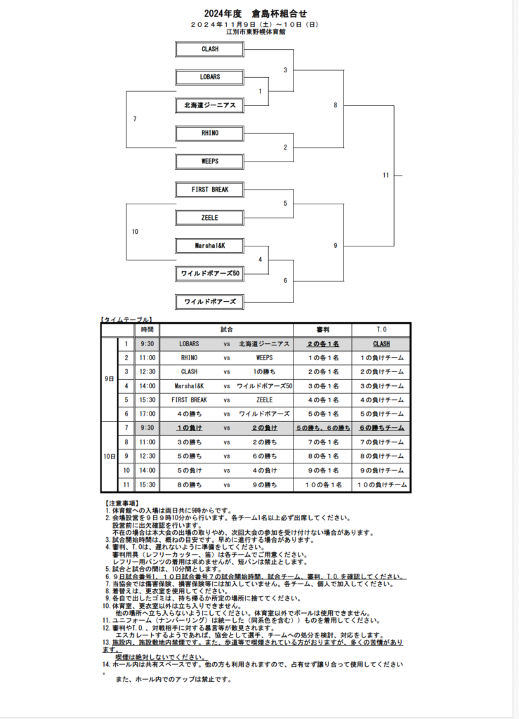 11月9日(土)、10日(日)江別市東野幌体育館で開催される「2024年度 倉島杯」の組合せが決定しました会場は土足厳禁です また、敷地内は禁煙となっております -